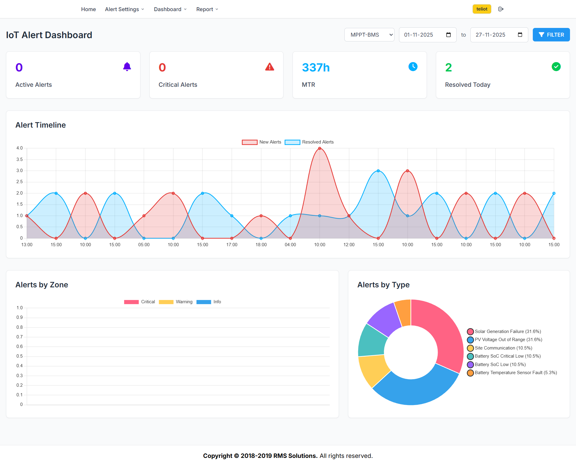 • Active Alerts for immediate threats (e.g., Solar Generation Failure, High Battery