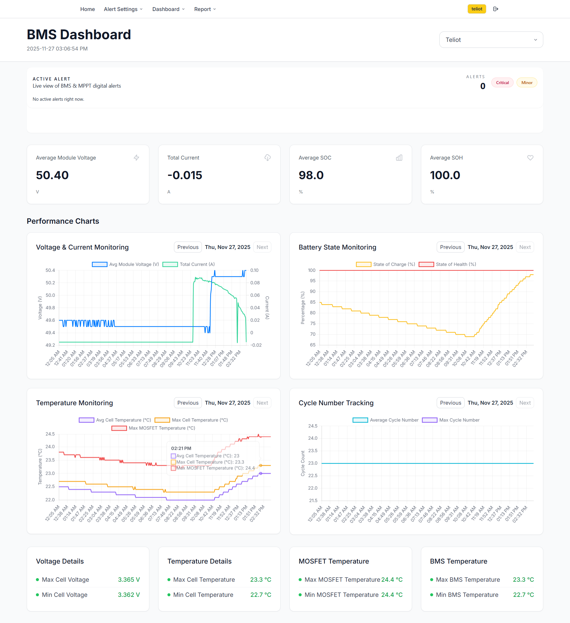 Health Metrics: Monitor State of Charge (SOC) and State of Health (SOH) with precision.